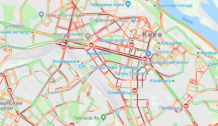 Так, в пробках стоят многие центральные улицы столицы, а также Северный мост, мост Метро и мост Патона.