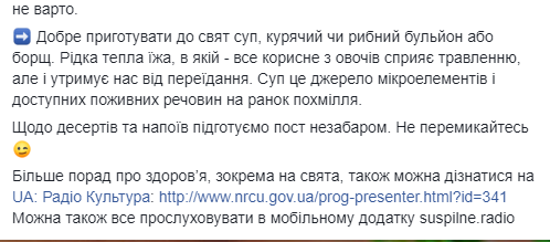 Также по мнению Супрун, хорошо приготовить к праздникам суп, куриный или рыбный бульон или борщ. "Жидкая теплая пища, в которой - все полезное из овощей способствует пищеварению, но и удерживает нас от переедания. Суп этот источник микроэлементов и доступных питательных веществ на утро при похмелье", - написала она.