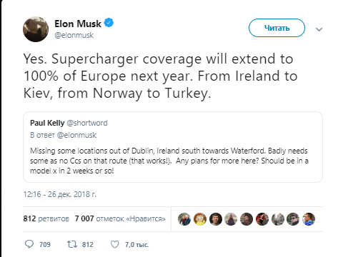 Маск ответил, что скоро можно будет доехать до Киева из Ирландии, пишет Сегодня. “Да, в следующем году суперчарджеры покроют всю Европу. От Ирландии до Киева, от Норвегии до Турции”, — ответил Маск.