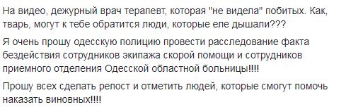 В Одессе погиб мужчина, которого медики “скорой” бросили во дворе областной больницы.  Об этом сообщил родственник умершего Дмитрий Грабовый на своей странице в Facebook.