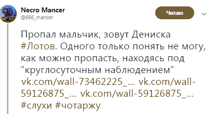 “Пропал мальчик, зовут Дениска Лотов. Одного только понять не могу, как можно пропасть, находясь под “круглосуточным наблюдением”, – написал он и прикрепил к посту скришоты.
