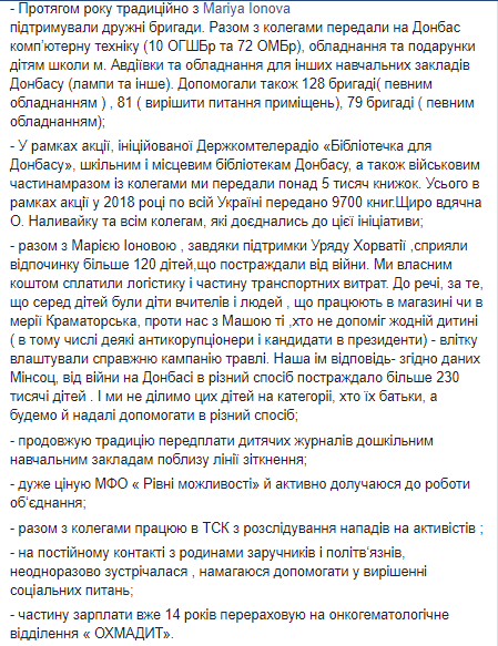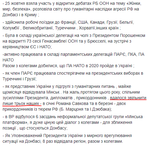 "Как представитель Украины в подгруппе по гуманитарным вопросам, почти ежемесячно посещала Минск. К сожалению, в этом году, общим усилиями президента, дипломатов, пограничников, удалось освободить лишь трех наших - в январе Романа Савкова и в марте - двух пограничников из тюрем РФ (Б. Марцоня и И.Дзюбака)", - отметила Геращенко.
