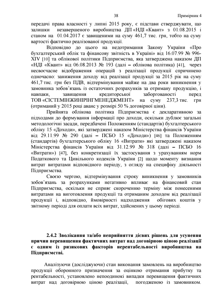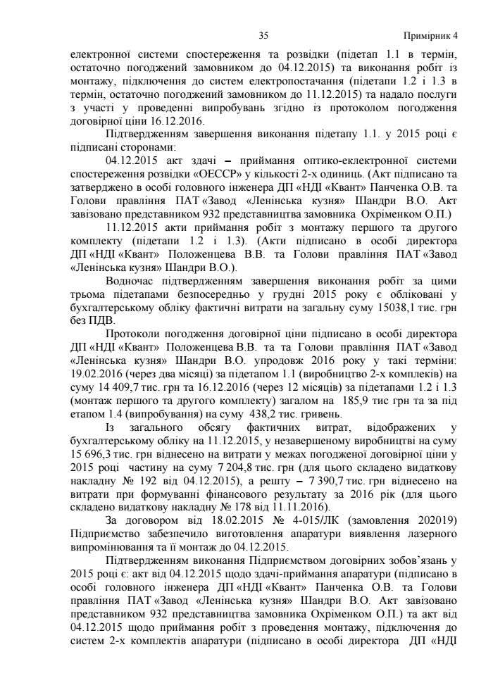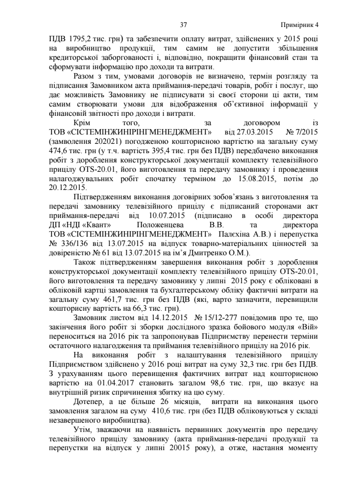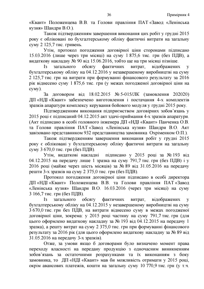 "Отже, за умови, якщо б договорами було визначено момент права переходу власності на передану продукцію з одночасним виникненням зобов’язань за остаточними розрахунками та їх виконанням з боку замовника, то ДП "НДІ "Квант" мав би можливість отримати у 2015 році, окрім авансових платежів, кошти на загальну суму 10,77 млн грн та забезпечити оплату витрат, здійснених у 2015 році на виробництво продукції, тим самим не допустити збільшення кредиторської заборгованості і, відповідно, покращити фінансовий стан та сформувати інформацію про доходи та витрати", - такого висновку дійшли аудитори.