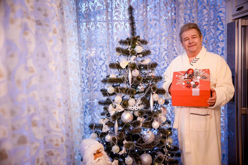 Нардеп из «Воли народа» Михаил Поплавский в Facebook поздравил своих читателей с Новым годом в белом халате у новогодней елки. В руках он держал подарок с украшениями и блестящей лентой.