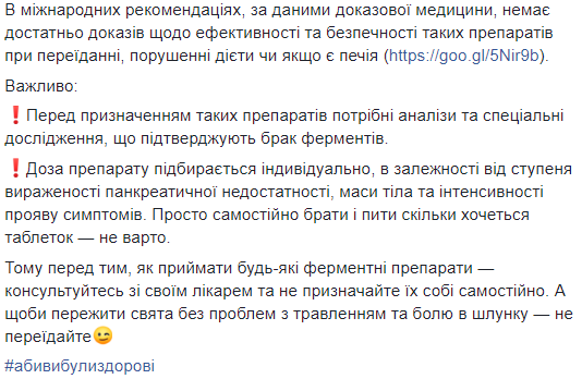 Также она уточнила, что в медицине нет достаточного количества доказательств эффективности и безопасности таких препаратов при переедании, нарушении диеты или если есть изжога. При назначении ферментных препаратов нужны анализы и специальные исследования, подтверждающие отсутствие ферментов. При этом доза препарата подбирается индивидуально (в зависимости от степени выраженности панкреатической недостаточности, массы тела и интенсивности проявления симптомов).