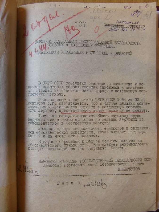 “В НКГБ СССР поступают сведения о намерении и попытках некоторых обновленческих: епископов и священников перейти из обновленческой церкви в патриаршую сергиевскую церковь.