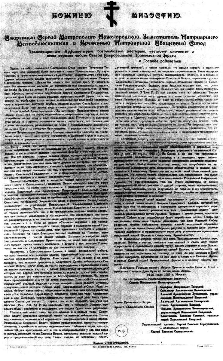 А ось вам Декларація від митрополита Сергія 1927 р.. “Нам нужно не на словах, а на деле показать, что верными гражданами Советского Союза, лояльными к Советской власти, могут быть не только равнодушные к Православию люди, не только изменники ему, но и самые ревностные приверженцы его, для которых оно дорого, как истина и жизнь, со всеми его догматами и преданиями, со всем его каноническим и богослужебным укладом.” Церква в документі названа всеросийская православная церковь”.