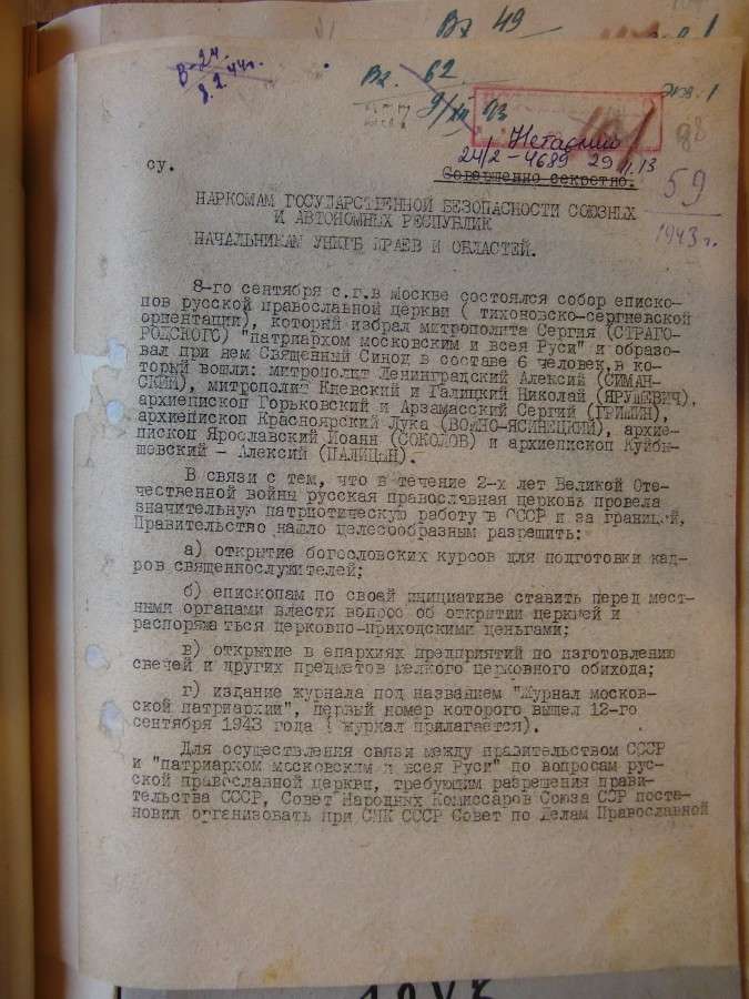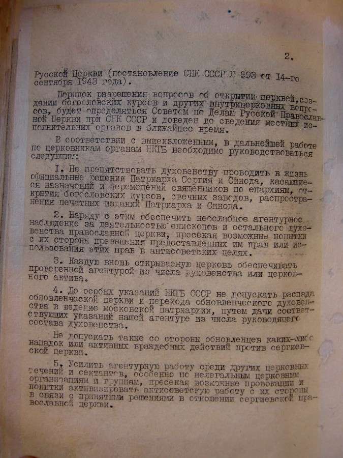 2. Наряду с этим обеспечить неослабное агентурное наблюдение за деятельностью епископов и остального духовенства православной церкви, пресекая возможные попытки с их стороны, превышения предоставленных им прав или использования этих прав в антисоветских целях.