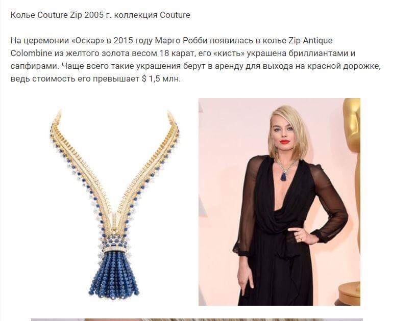 Отметим, что чаще всего такие украшения, как колье Zip, берут в аренду для выхода на красную дорожку, ведь его стоимость превышает 1,5 млн дол. Так, к примеру, в 2015 году в колье Zip Antique Colombine из желтого золота весом 18 карат на красной дорожке появилась известная австралийская актриса Марго Робби.