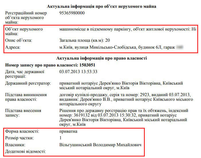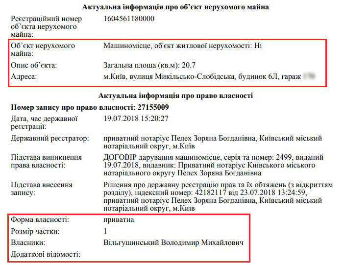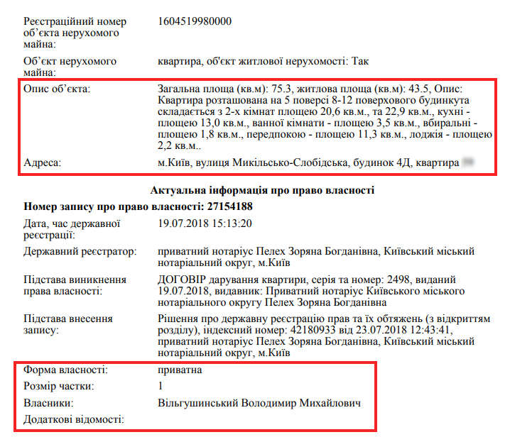 Місцем реєстрації підприємницької діяльності Володимира Вільгушинського зазначена квартира у м. Києві на вул. Мишуги, 1/4. У реєстрі речових прав ця квартира не зареєстрована, а тому невідомо, кому вона належить.