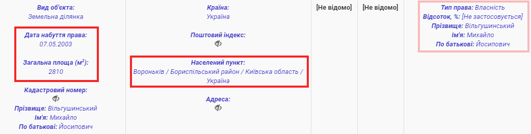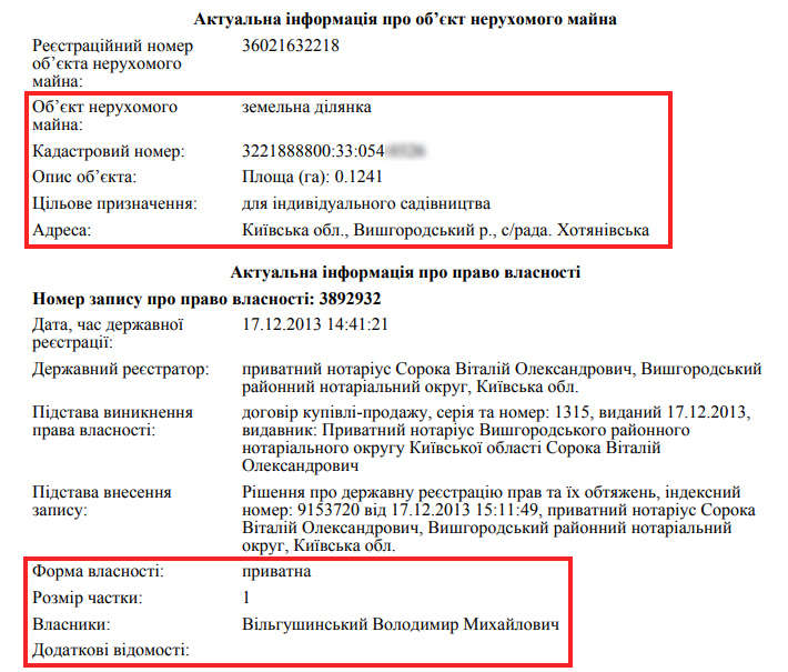 Саме ці земельні ділянки зацікавили журналістів. У 2015 році «Наші гроші» виявили, що у матері та сина судді Вільгушинського у власності є 6 коштовних земельних ділянок, площею майже 82 сотки у с. Хотянівка під Києвом. Дві земельні ділянки вони набули безкоштовно, а ще 4 ділянки, площею 62 сотки, придбали у 2012 та 2013 роках. За даними журналістів, середня ринкова ціна сотки землі у цьому місці складала майже 2 800 $. Тобто витрати пенсіонерки та студента мали би скласти близько 170 000 доларів. Навіть якщо допустити, що ринкова вартість цих земельних ділянок знизилась втричі, то 60 000 доларів також виглядають непідйомними для цих членів родини судді.