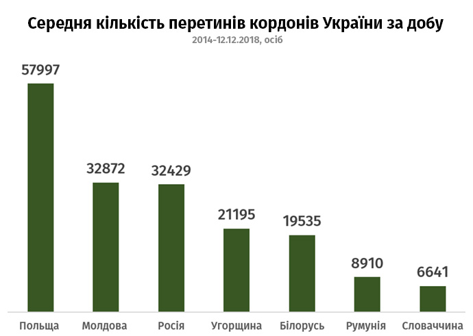 В среднем за день сухопутные границы Украины пересекают 179,6 тысяч человек. Чаще всего пересекают границы Украины с Польшей, Молдовой и Россией.