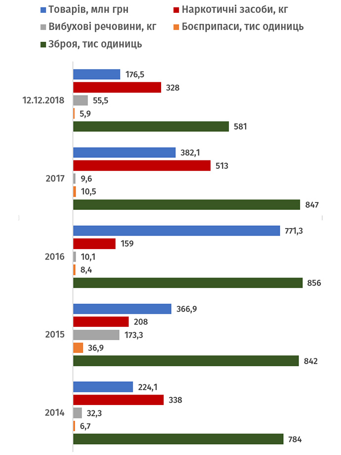 В течение 2014-2018 годов пограничники обнаружили 3,9 тыс единиц контрабандного оружия, 280,8 килограммов взрывчатки, 1,55 тонн наркотических средств и товаров на 1,921 млрд грн.