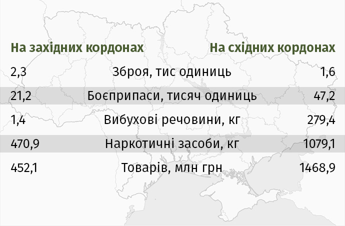 При этом на западных границах чаще ловят на контрабанде оружия, чем на восточных. Восточные границы преобладают по количеству случаев контрабанды боеприпасов, взрывчатки, наркотиков и товаров.