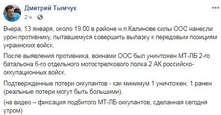 “Вчера, 13 января, около 19.00 в районе н.п. Калиновое, силы ООС нанесли урон противнику, пытавшемуся совершить вылазку к передовым позициям украинских войск. После выявления противника, воинами ООС был уничтожен МТ-ЛБ 2-го батальона 6-го отдельного мотострелкового полка 2 АК российско-оккупационных войск”, – сообщает Тымчук.