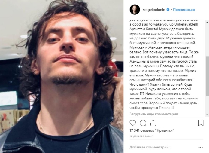 В частности, не так давно Полунин призвал в Instagram “давать подсрачники, когда видите жирных людей”. Этот пост был удален. На тему гендерной проблематики танцор высказывался так: “Женщины в мире сейчас пытаются стать на роль мужчины, потому что вы их не трахаете, и потому что вы позор”.