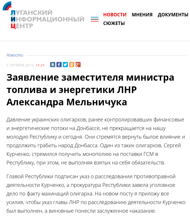 На скриншоте – вот так «министр угольной промышленности «ЛНР» Александр Мельничук боролся с конкурентом в лице Сергея Курченко.