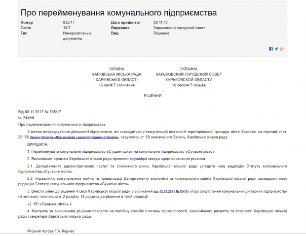 Что только не предпринимает городская власть, чтоб прибрать к рукам такой лакомый кусок. И вот, для того, чтобы все выглядело красиво, горсовет создает коммунальное предприятие "Сучасне місто". Точнее даже не создает, а переименовывает. За основу берется ранее существующее КП "Студентське", которое согласно открытым реестрам Министерства юстиции, занималось организацией школьного питания. Новому-старому КП расширяют сферу деятельности и подчиняют Департаменту административных услуг и потребительского рынка Харьковского горсовета.