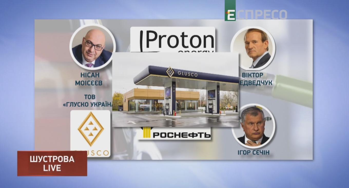 Продажи российского дизтоплива с нефтепродуктопровода в Украине контролирует группа «Proton Energy» израильского бизнесмена Ниссана Моисеева, друга Медведчука. Его компания ООО «Глуск Украина» стала одним из крупнейших импортеров сжиженного газа из России, а именно с заводов государственной «Роснефти», которой руководит давний друг Путина Игорь Сечин. На месте российской «ТНК» Моисеев развивает собственную сеть заправок под торговой маркой «Глуск».