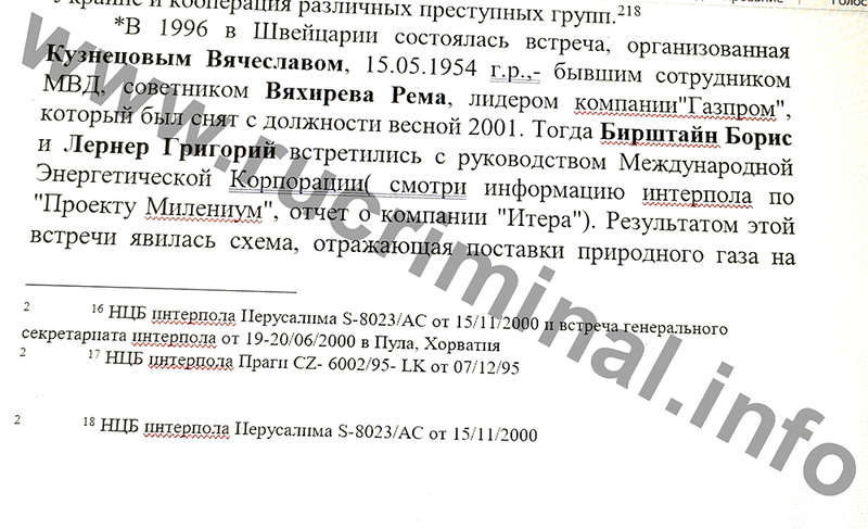 Это можно понять из документов «Интерпола» и МВД РФ. Еще в начале 90-х годов полиция Венгрии зафиксировала, что у людей Могилевича откуда-то появились ценные бумаги «Газпрома», которые они, что называется, прокручивали. Бумаги клались в банк в качестве депозита, на этом основании получались кредиты. Деньги пускались в развитие прибыльного преступного бизнеса, а потом акции выкупались назад. Откуда они появились у представителей Севы Киевского удалось выяснить российским оперативникам. В тот момент времени Могилевич наладил отношения с бывшим сотрудником МВД РФ Вячеславом Кузнецовым, занимавшим должность советника главы «Газпрома» Рэма Вяхирева. Именно он и помогал гангстерам получать и прокручивать акции. Однако, только этим подобное сотрудничество не ограничилось. Согласно данным Интерпола, которые есть в распоряжении rucriminal.info, в 1996 в Швейцарии состоялась встреча, в которой принимали участие Могилевич, Кузнецов, теневой делец Бирштейн и еще несколько человек. На ней и были разработаны схемы по поставке российского и туркменского природного газа на Украину. В России разработанный план поддержали Вяхирев и его приятель премьер-министр Виктор Черномырдин. На Украине его поддержал премьер-министр Павел Лазаренко. Договориться с ним было меньше всего проблем – «правая рука» Могилевича Игорь Фишерман занимал пост советника Лазаренко. Другим ближайшим помощником Севы Киевского являлся Станислав Николаев, нынешний глава «Меркатора».