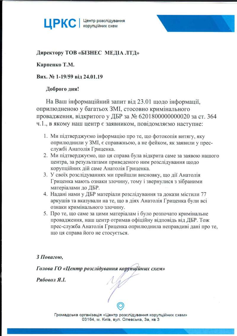 Именно по этим материалам и было начато уголовное производство, о котором Анатолий Гриценко заявил, что не имеет к нему никакого отношения. Об этом центр получил официальный ответ от ГБР.