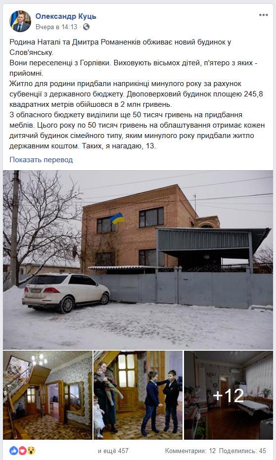Невероятная по своей мерзости и тупости история произошла в Донецкой области. Глава Донецкой ОВГА Александр Куць написал о том, как власть за бюджетные деньги купила большой дом для многодетной семьи переселенцев из ОРДЛО.