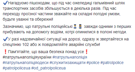 "По данным Гидрометцентра, 26 января в Одессе и области сохранится гололед и гололедица. Призываем водителей быть максимально внимательными и осторожными за рулем, неуклонно соблюдать скоростной режим. Учитывая ситуацию на дорогах, воздержаться от поездок на дальние расстояния. Не оставляйте транспортные средства в местах, где они будут усложнять работу спецтехники. Пешеходам напоминаем: во время гололеда тормозной путь транспортных средств увеличивается в несколько раз", - предупредили копы.
