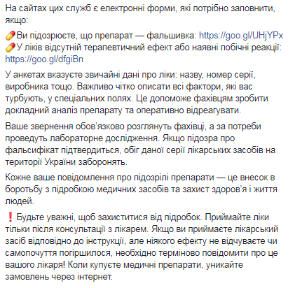 "Будьте внимательны, чтобы защититься от подделок. Принимайте лекарства только после консультации с врачом. Если вы принимаете лекарственное средство согласно инструкции, но никакого эффекта не ощущаете ли самочувствие ухудшилось, необходимо срочно сообщить об этом вашему врачу! Когда покупаете медицинские препараты, избегайте заказов через интернет", - посоветовала Супрун.