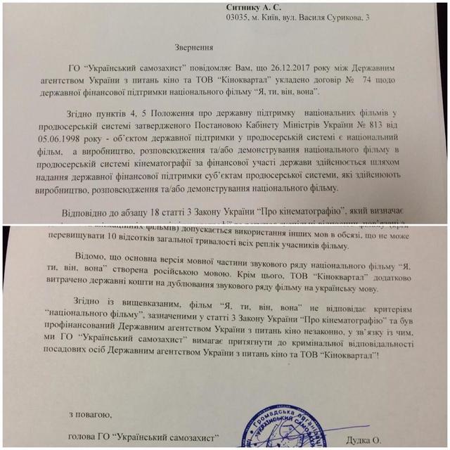 Фільм кінокомпанії Володимира Зеленського «Я, ти, він, вона» був повністю відзнятий російською мовою (не відкидаємо мотивів його показу на території країни-агресора) і лише згодом стрічку продублювали українською мовою, на що було витрачено додаткові кошти. Тому укладення Договору про надання державної фінансової підтримки такого «національного фільму», на думку юристів Юлії Тимошенко, містить ознаки злочину «Привласнення, розтрата майна або заволодіння ним шляхом зловживання службовим становищем, вчинені в особливо великих розмірах або організованою групою».