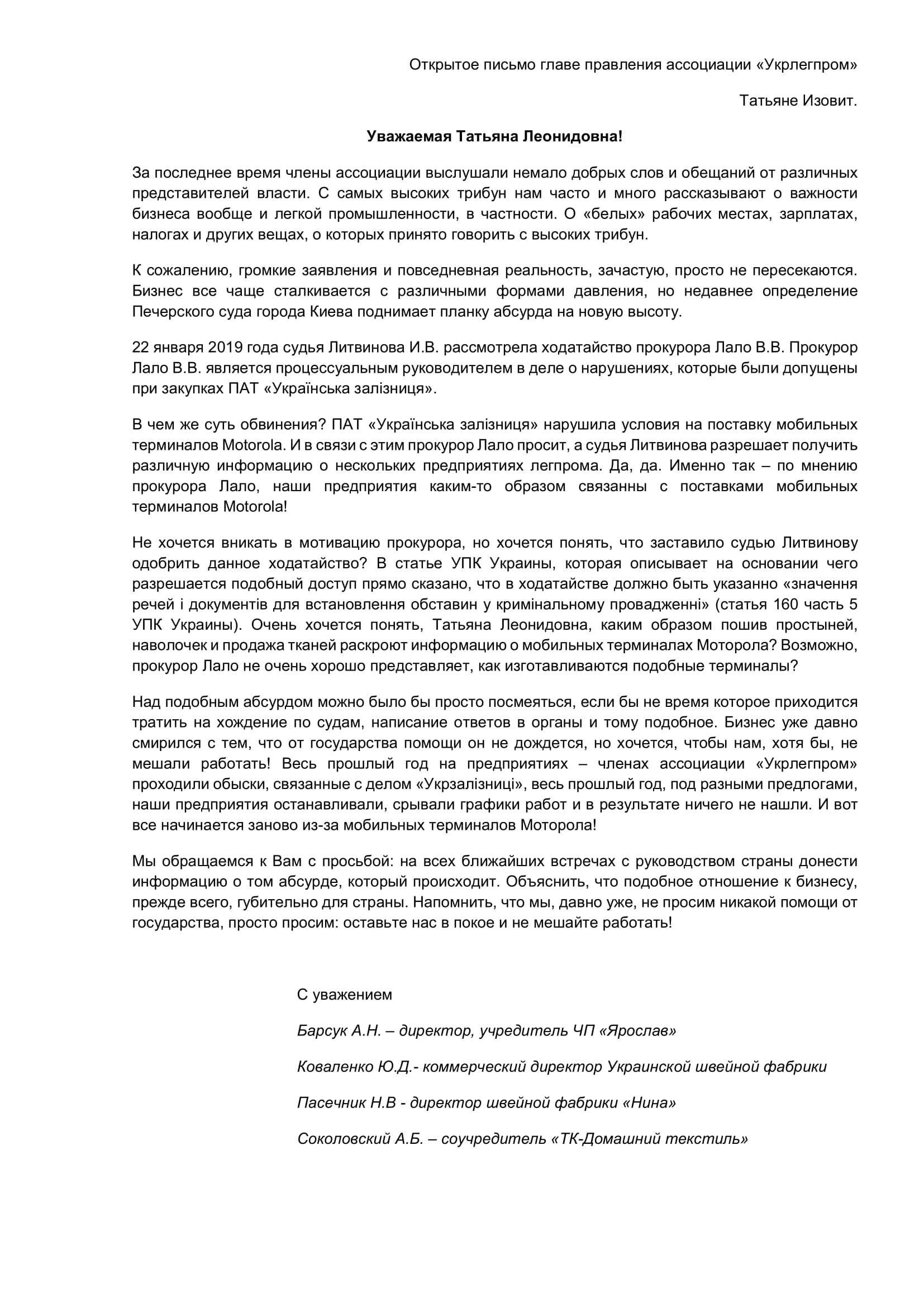 «Весь прошлый год на предприятиях – членах ассоциации «Укрлегпром» проходили обыски, связанные с делом «Укрзалізниці», весь прошлый год, под разными предлогами, наши предприятия останавливали, срывали графики работ и в результате ничего не нашли. И вот все начинается заново из-за мобильных терминалов Моторола!» - подчеркивается в письме.