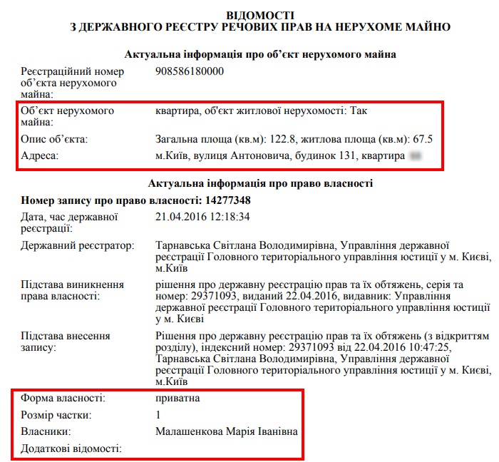 190 000 долл. США - минимальная цена на квартиру в этом же доме похожей площади. Издание strana.ua со ссылкой на инвестиционный договор сообщило, что квартира стоила около 260 000 долларов США. Откуда мать участницы ВСП взяла такие средства - неизвестно, ведь в досье кандидата написано, что Мария Малашенкова пенсионерка, а раньше трудилась главным бухгалтером в ОАО «Тетрис».