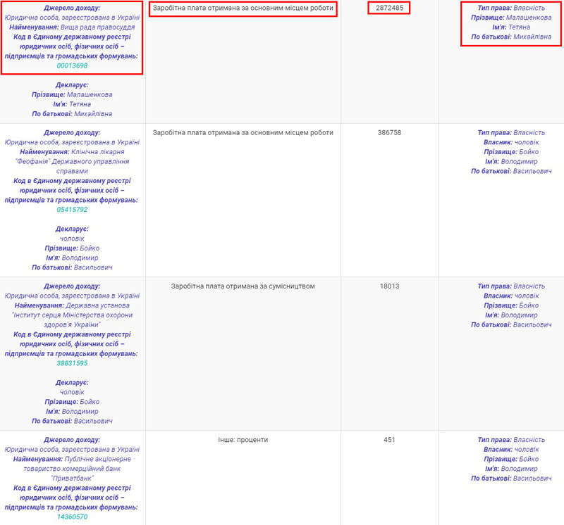 Мы проанализировали обнародованные в открытом доступе декларации Татьяны Малашенковой за 2014, 2015, 2016 и 2017 годы. Членкиня Высшего совета правосудия получает большую заработную плату. Только за 2017 год ей выплатили 2,8 млн грн и 8600 социальной помощи. Ее муж, работающий в больнице «Феофания» Госуправления делами, принес семейному бюджету 386 758 грн. Дополнительно семья продала отцу Малашенковой Михаилу автомобиль и заработала на этом 446 651 грн.