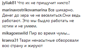 «Пир посреди чумы», «Ну хоть не так открыто бы делал, б…ть. Вообще ох…ели, с..ки», «Твари ненасытные обворовали всю страну и жируют», «Твари когда вас уже всех посадят за воровство! Враги народа!», «Мерзко!», «Ну, что скажешь, надо ещё пенсионный возраст поднять, в то на следующий юбилей не хватит», — писали возмущенные пользователи.