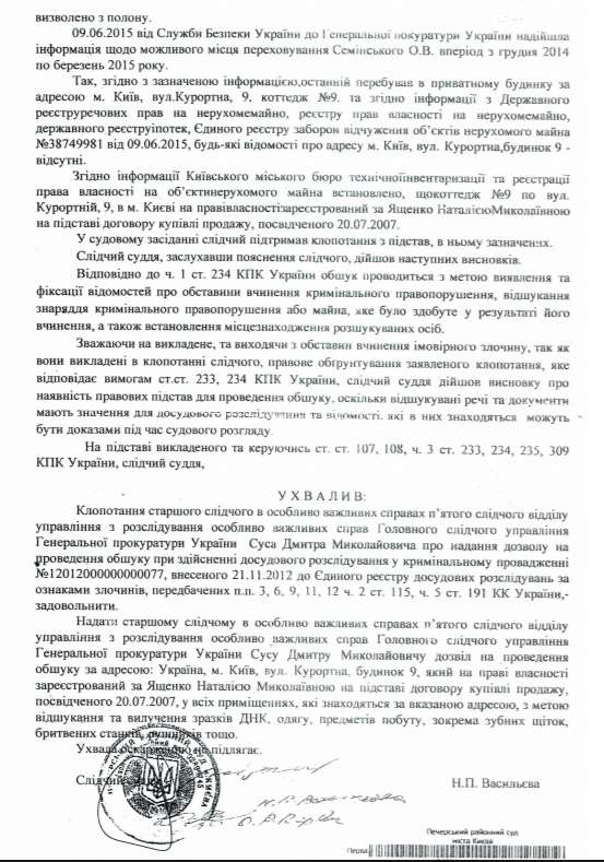 У червні 2015 суддя Печерського суду Васильєва (тепер уже покійна) видала слідчому Сусу ухвалу на обшук котеджу в Києві по вул. Курортна,9. Цьому зверненню передувало повідомлення СБУ, що з грудня 2014 по березень 2015 Семінський начебто утримувався саме в цьому будинку.