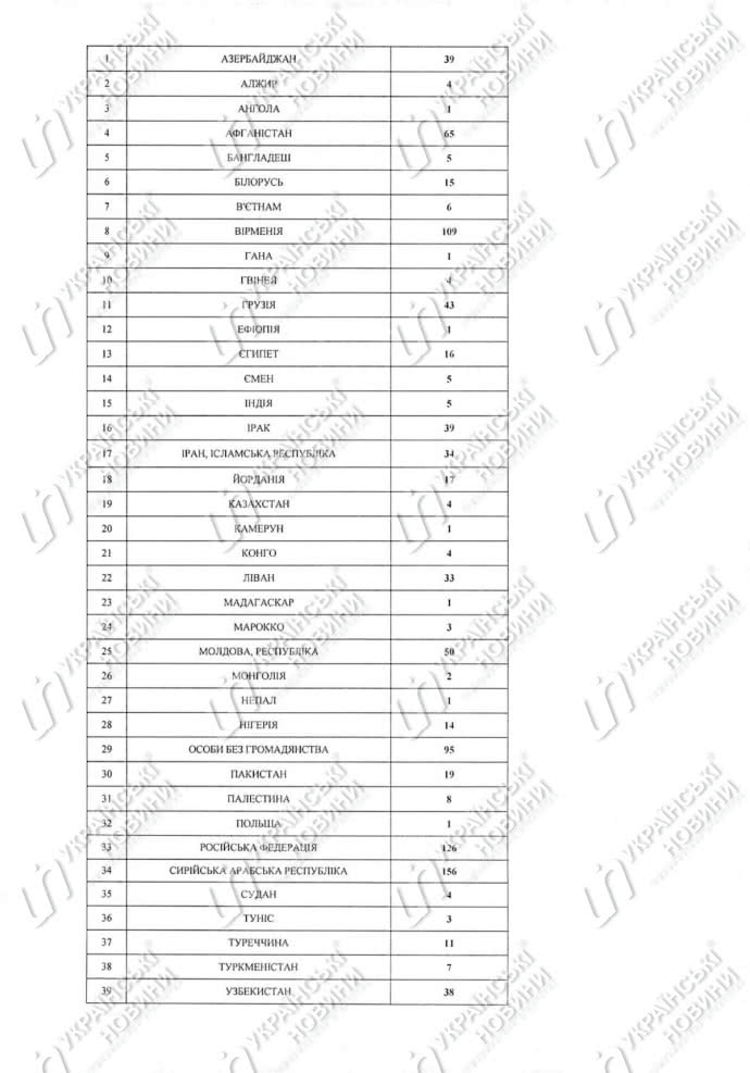 Также в украинское гражданство были приняты 65 выходцев из Афганистана, 50 из Молдовы, 43 из Грузии, по 39 из Азербайджана и Ирака, 38 из Узбекистана, 34 из Ирана, 33 из Ливана, 19 из Пакистана, 17 из Иордании, 16 из Египта, 15 из Беларуси, 14 из Нигерии и 11 из Турции.