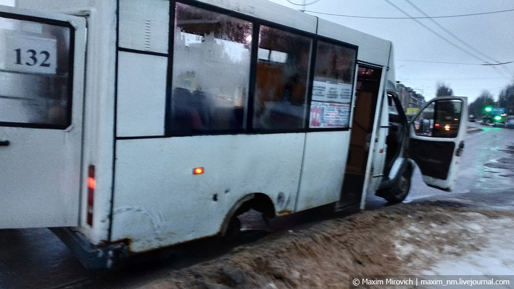 Из общественного транспорта в «ЛНР» остались, в основном, маршрутки — они ходят без расписания, каждый маршрутчик может уехать с марштута, когда захочет, не доехать до конечной и прочее. Свобода! На фото — убитая луганская маршрутка, у которой прямо на повороте дороги отвалилось заднее колесо: