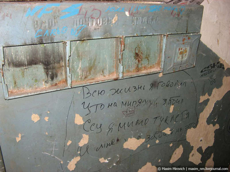 Подъезды выглядят примерно вот так. На стене можно увидеть патриотические стихи «путинского мира» с непременной обсценной лексикой, а также «лэнээровские» почтовые ящики с выломанными и сданными на металлолом дверцами.