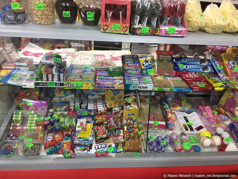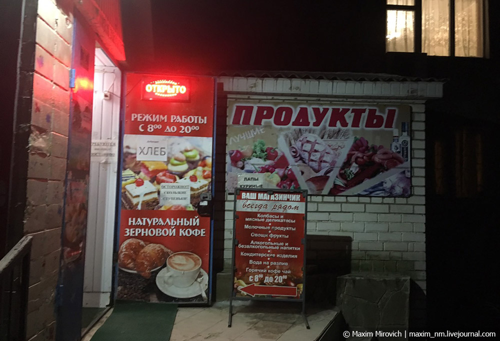 Обычный народ больше ходит вот в такие маленькие магазинчики, которые устроены в подъездах и всяких небольших помещениях. Работают магазины с 8 до 20:00 и обещают каждый день хлеб хорошего качества, а также «лапы куриные».