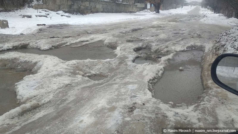 Дороги в Луганске выглядят сейчас вот так. Дороги не чистят и не ремонтируют от слово «совсем» — и посреди некогда оживлённого шоссе можно увидеть вот такие ямы, заполненные талой водой.
