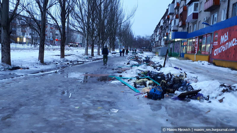 Центральные улицы некогда оживлённого города сейчас напоминают страшный город-призрак из какой-то антиутопии. Заледенелые тротуары, горы мусора вдоль дороги, почти полное отсутствие автомобилей на проезжей части, занесённой снегом.