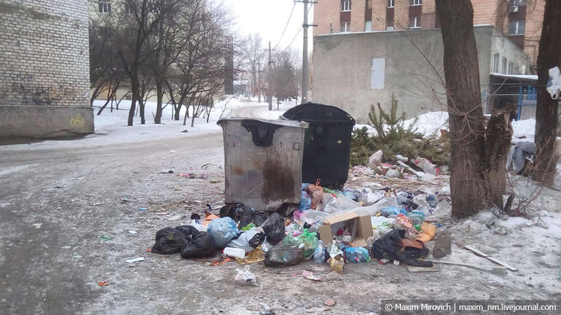 А теперь давайте посмотрим, как это всё выглядит в реальности. Мусор в Луганске перестал вывозиться уже достаточно давно, и дворы в городе выглядят как-то так. Луганчане кричали «Россия, приди!», и вот она пришла — правда, не в виде Москвы из телевизора, а Омска из действительности.