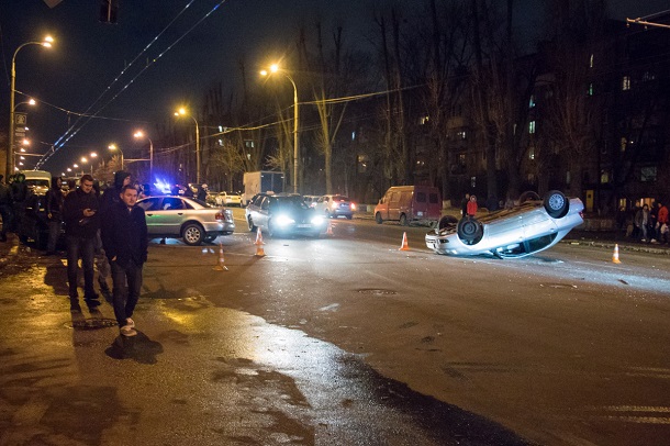 В ночь на понедельник, 18 февраля, в Киеве произошла авария с участием трех машин, в результате чего одно авто перевернулось и пострадал один человек.