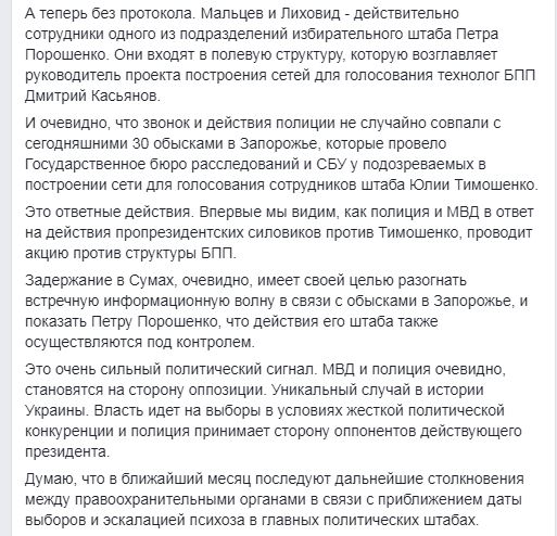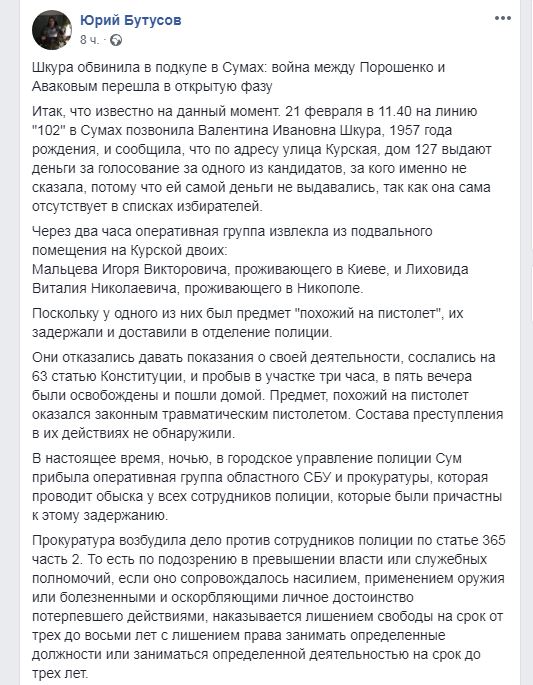 «БПП, очевидно, повторяет технологии Чернигова. Новость хороша особенно тем, что админресурс на этих выборах перестал быть монополией президента. Будем ждать суда, очень хочется посмотреть видео задержания, героев этой драмы, ну и деньги изъятые»,-пишет Бутусов.