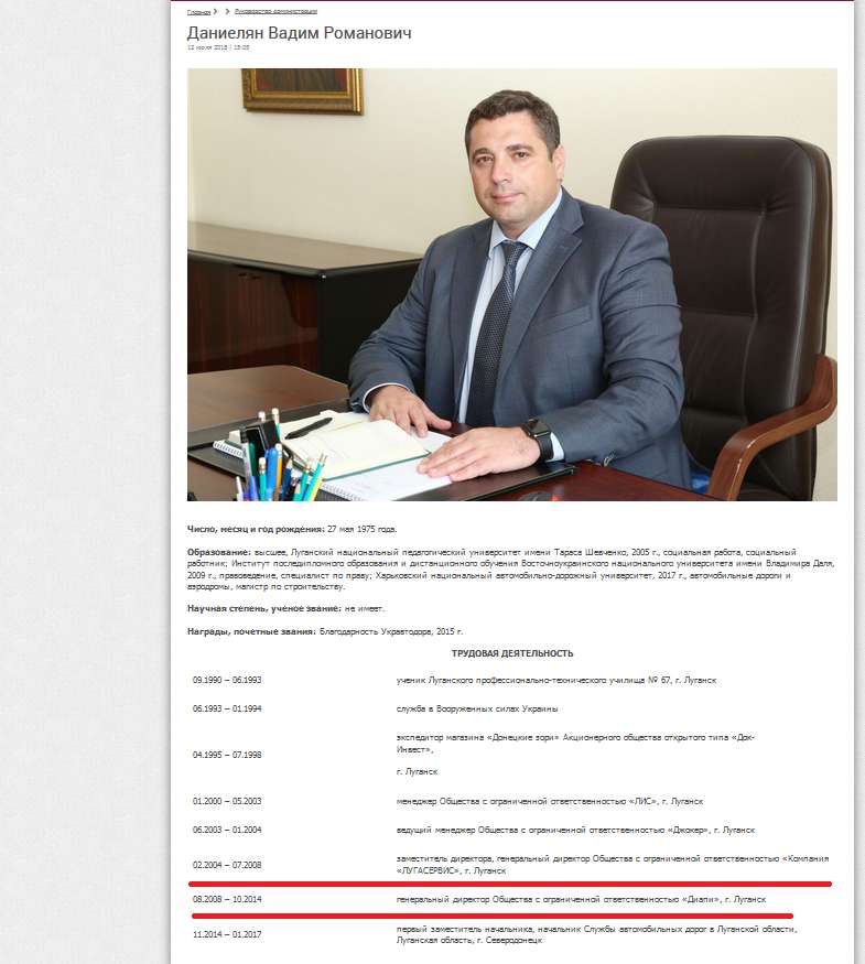 В тот момент Службу автомобильных дорог Луганской области возглавлял Артем Арапов, сменивший на этом посту Вадима Даниеляна (до этого Арапов был его первым замом). Даниелян до прихода на руководящую должность в Службу автомобильных дорог в 2014 г был известен как один из «крепких» бизнесменов Луганска, где он руководил ООО «Компания Лугасервис» и «Диапи».