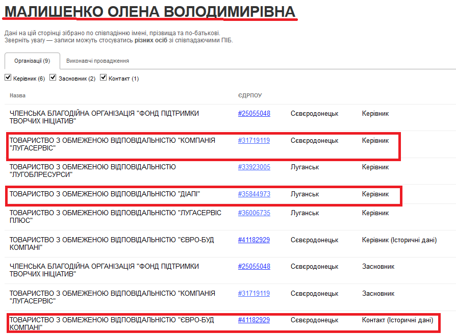 До этого она была директором «Евро-Буд Компани», и уступила это кресло Скляному в январе 2018 г., то есть за считанные недели до победы компании в первом тендере Службы автомобильных дорог Луганской области. Одновременно Малышенко до сих пор числится директором в ООО «Компания Лугасервис» и «Диапи» – тех самых структурах, которые Вадим Даниелян возглавлял до прихода в Службу автодорог.