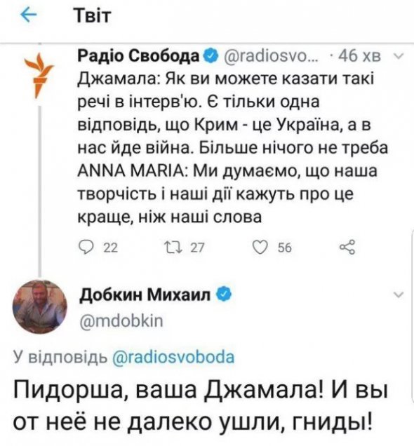 Бывший "регионал", нардеп от "Опоблоку" Михаил Добкин обозвал певицу Джамалу за ее напоминание, что Крым - это Украина. Скандальный сообщение нардепа появился в переписке Twitter.