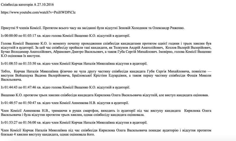 В решении суда, который отменил результаты конкурса 2016 года, указывается, что во время выступлений кандидатов некоторые члены комиссии не присутствовали в аудитории, отлучались, не слушали выступающих, однако в итоге оценивали всех кандидатов и отдали предпочтение Фощию и Кирилюку. Понятно, что это говорит о том, что результаты конкурса были сфальсифицированы заранее (см. скрины).