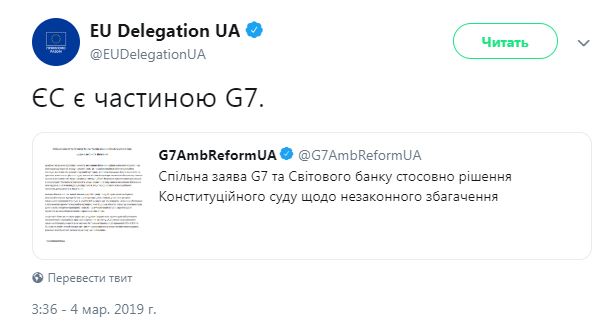 Это заявление также поддержал Евросоюз. Представительство ЕС в Украине ретвитнуло соответствующее заявление в своем в Twitter, отметив, что "ЕС является частью G7".