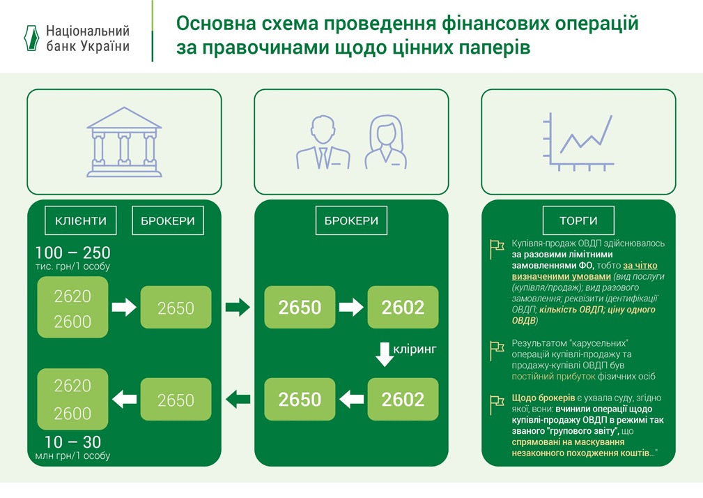 Согласно нему, главная особенность подобных операций — покупка ОВГЗ по более высокой цене и продажа по более низкой (с убытком) с одним и тем же ISIN-кодом юрлица за короткий промежуток времени. По несколько раз на протяжении одного рабочего дня.