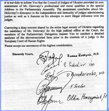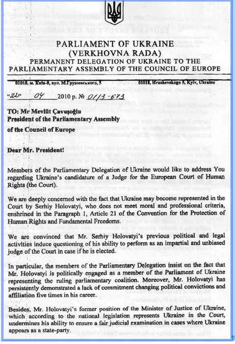 Про неприпустимість призначення С.Головатого суддею ЄСПЛ заявили частина делегатів України в ПАРЄ, а саме народні депутати України С.Соболєв, О.Бондаренко, Є.Суслов, Р.Зварич та О.Герасим’юк. У квітні 2010 року вони направили до ПАРЄ лист, у якому вказали, що «глибоко стурбовані тим фактом, що Україна може бути представлена в Європейському суді з прав людини Сергієм Головатим, який не відповідає моральним та професійним критеріям, які передбачені в статті 21 Конвенції про захист прав людини і основоположних свобод».